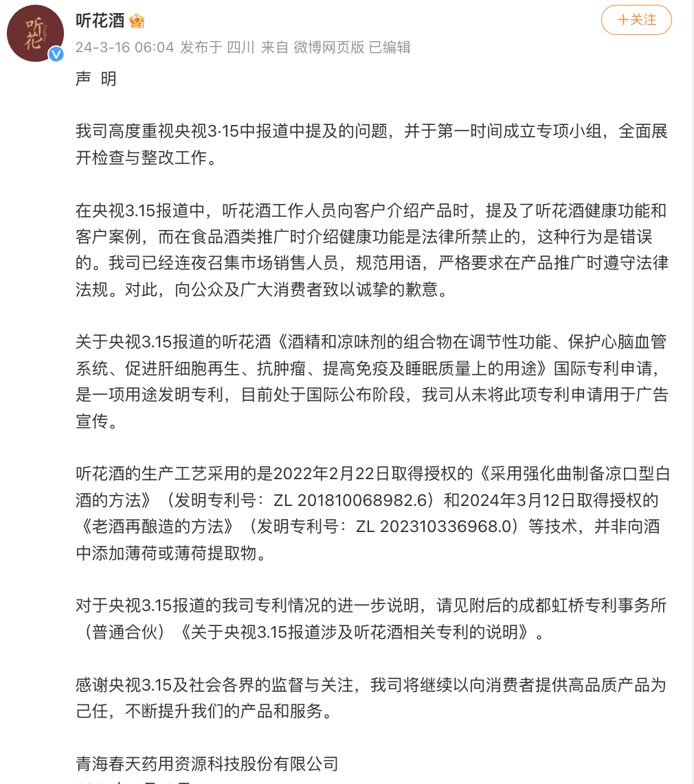 3月16日早,@聽花酒 發佈聲明:我司高度重視央視3·15中報道中提及的問題,並於第一時間成立專項小組,全面展開檢查與整改工作。在央視3.15報道中,聽花酒工作人員向客户介紹產品時,提及了聽花酒健康功能和客户案例,而在食品酒類推廣時介紹健康功能是法律所禁止的,這種行為是錯誤的。我司已經連夜召集市場銷售人員,規範用語,嚴格要求在產品推廣時遵守法律法規。對此,向公眾及廣大消費者致以誠摯的歉意。