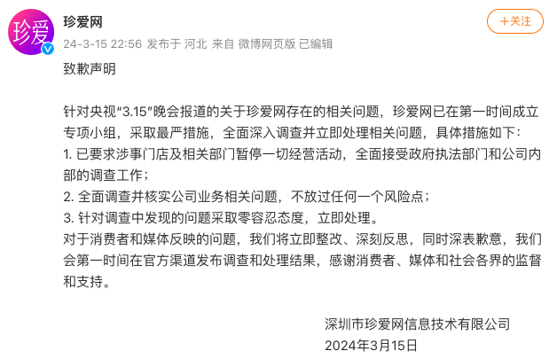 3月15日晚,@珍愛網 發佈致歉聲明:針對央視“3.15”晚會報道的關於珍愛網存在的相關問題,珍愛網已在第一時間成立專項小組,採取最嚴措施,全面深入調查並立即處理相關問題,具體措施如下:1. 已要求涉事門店及相關部門暫停一切經營活動,全面接受政府執法部門和公司內部的調查工作;2. 全面調查並核實公司業務相關問題,不放過任何一個風險點;3. 針對調查中發現的問題採取零容忍態度,立即處理。珍愛網表示,對於消費者和媒體反映的問題,將立即整改、深刻反思,同時深表歉意,會第一時間在官方渠道發佈調查和處理結果。