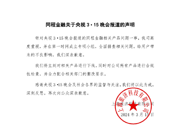 3月15日晚,同程金融發佈聲明:針對央視3·15 晚會報道的同程金融相關產品問題一事,我司高度重視,並在第一時間成立專項小組,全面排查相關問題。給用户帶來的不良影響,