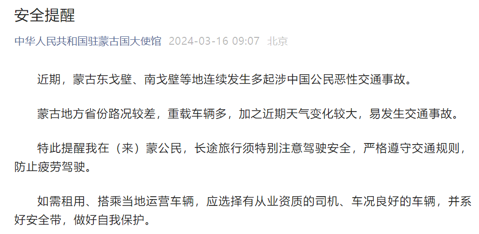 蒙古國東戈壁、南戈壁等地近期連續發生多起涉中國公民惡性交通事故,中使館發佈提醒