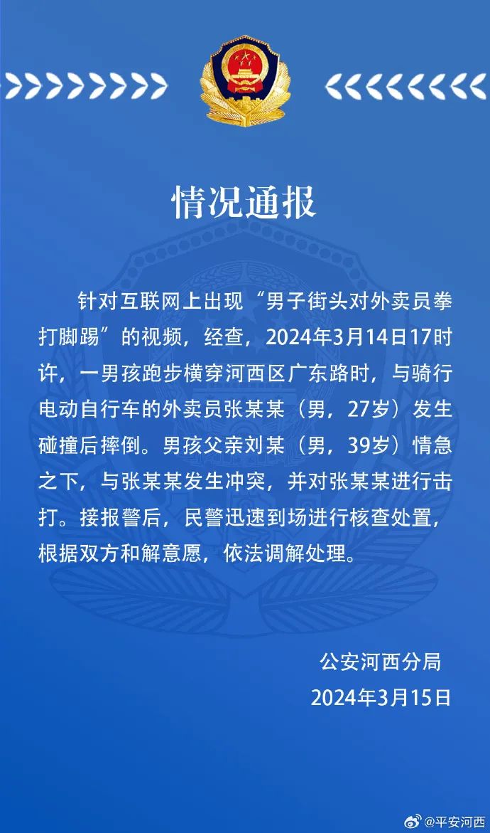 針對互聯網上出現“男子街頭對外賣員拳打腳踢”的視頻,經查,2024年3月14日17時許,一男孩跑步橫穿河西區廣東路時,與騎行電動自行車的外賣員張某某(男,27歲)發生碰撞後摔倒。男孩父親劉某(男,39歲)情急之下,與張某某發生衝突,並對張某某進行擊打。接報警後,民警迅速到場進行核查處置,根據雙方和解意願,依法調解處理。