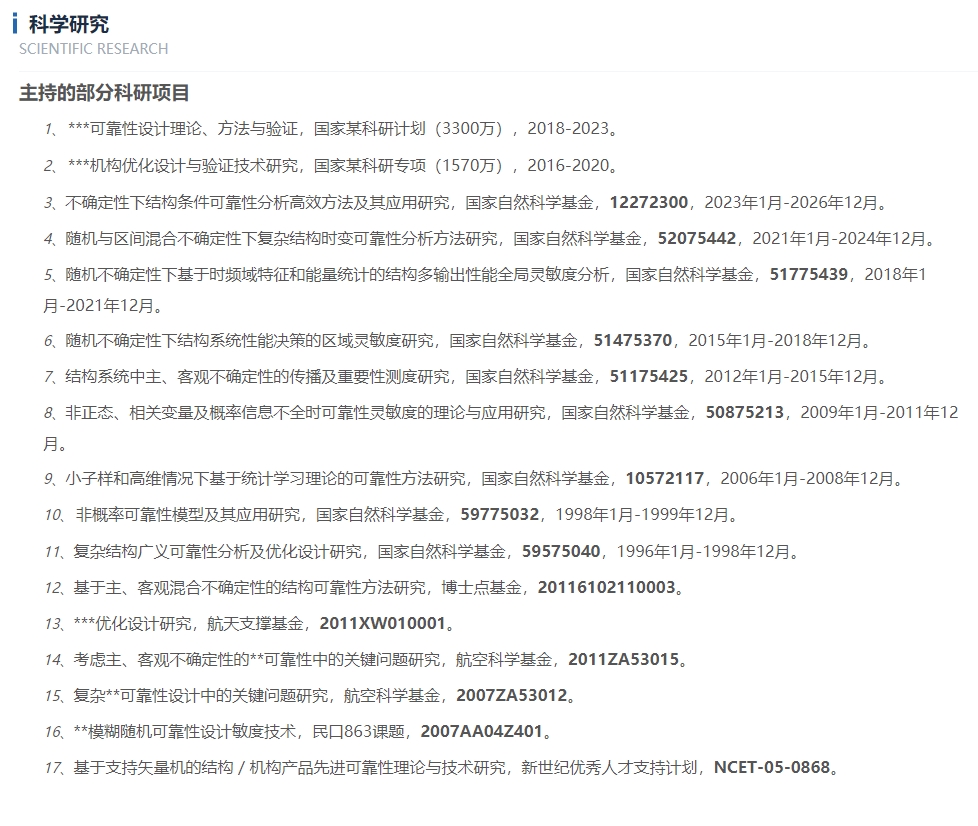西北工業大學航空學院教授呂震宙的教師個人主頁所列科研項目。