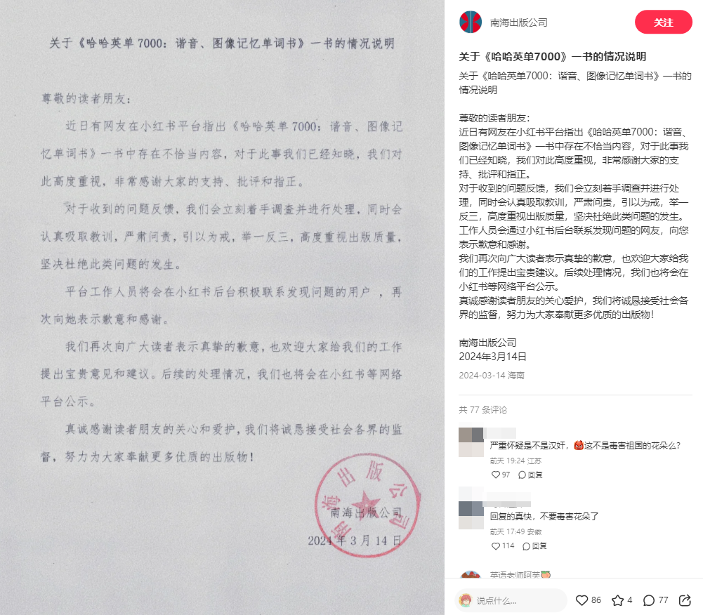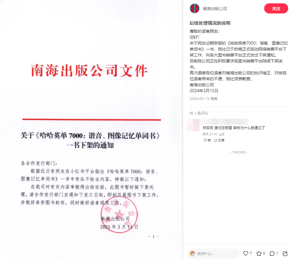 3月14日,出版《哈哈英單7000》的南海出版公司發文説明稱: