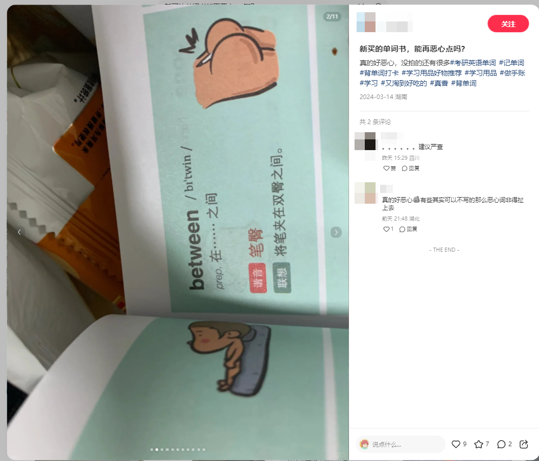 3月14日,網友在社交平台小紅書發出某單詞書的照片,認為其中許多單詞的諧音和聯想令人不適。
