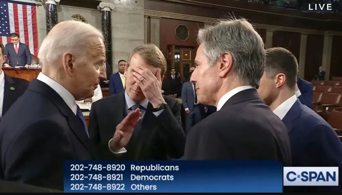 3月7日,拜登在國情諮文講話後與官員們交談