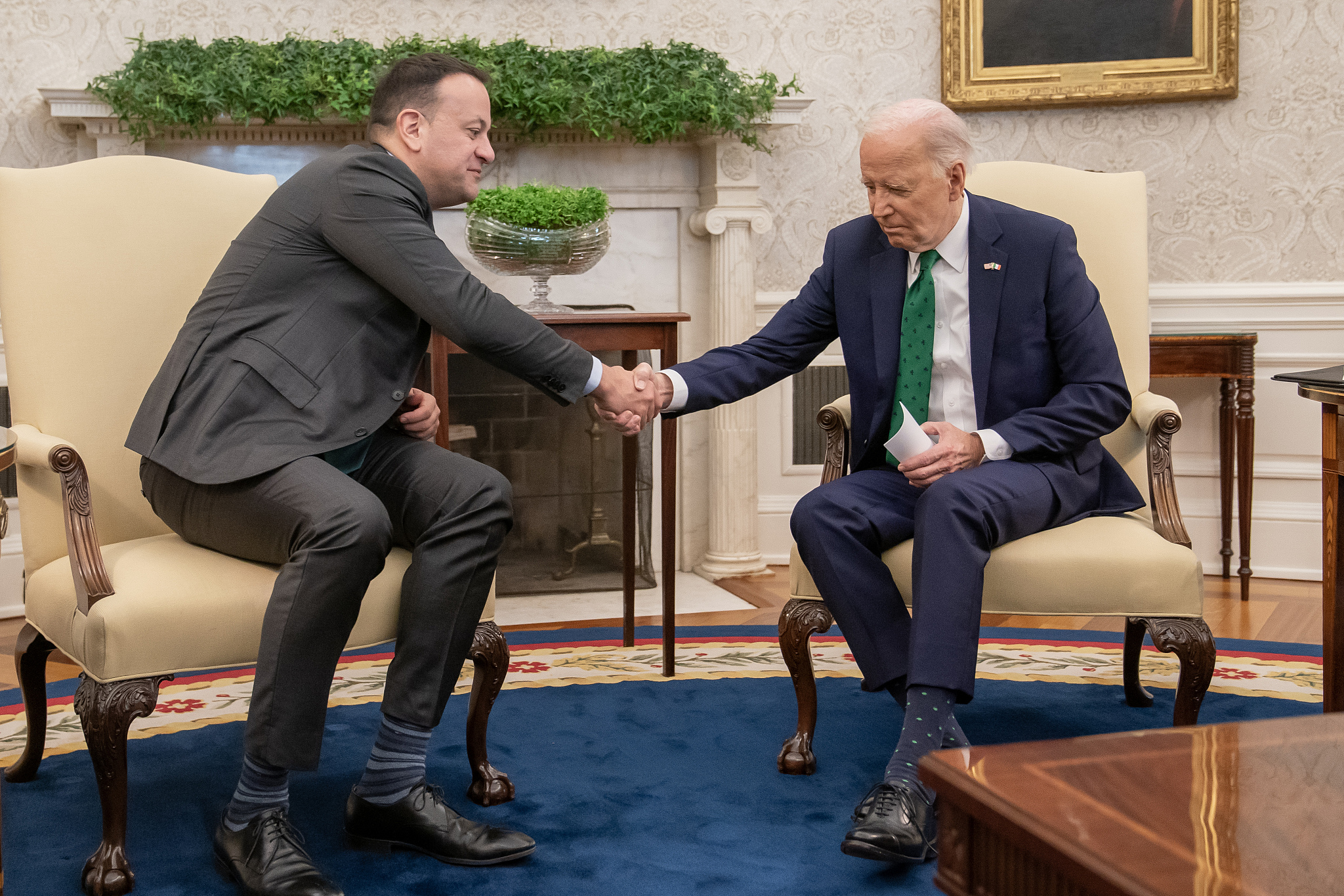 當地時間3月15日,美國總統拜登在白宮橢圓形辦公室會見愛爾蘭總理 圖自視覺中國