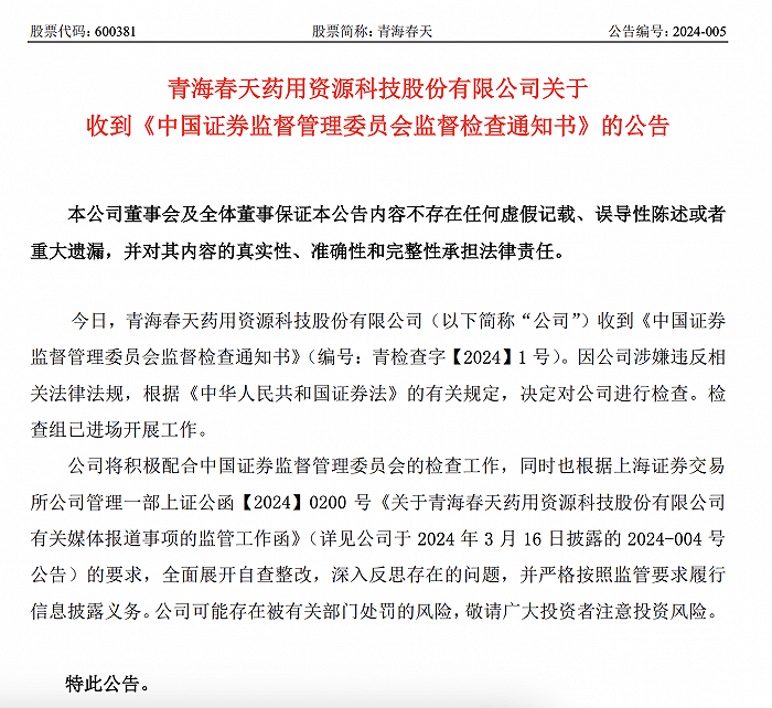 聽花酒母公司青海春天16日發佈公告稱,今日,公司收到《中國證券監督管理委員會監督檢查通知書》。因公司涉嫌違反相關法律法規,根據《中華人民共和國證券法》有關規定,決定對公司進行檢查。檢查組已進場開展工作。