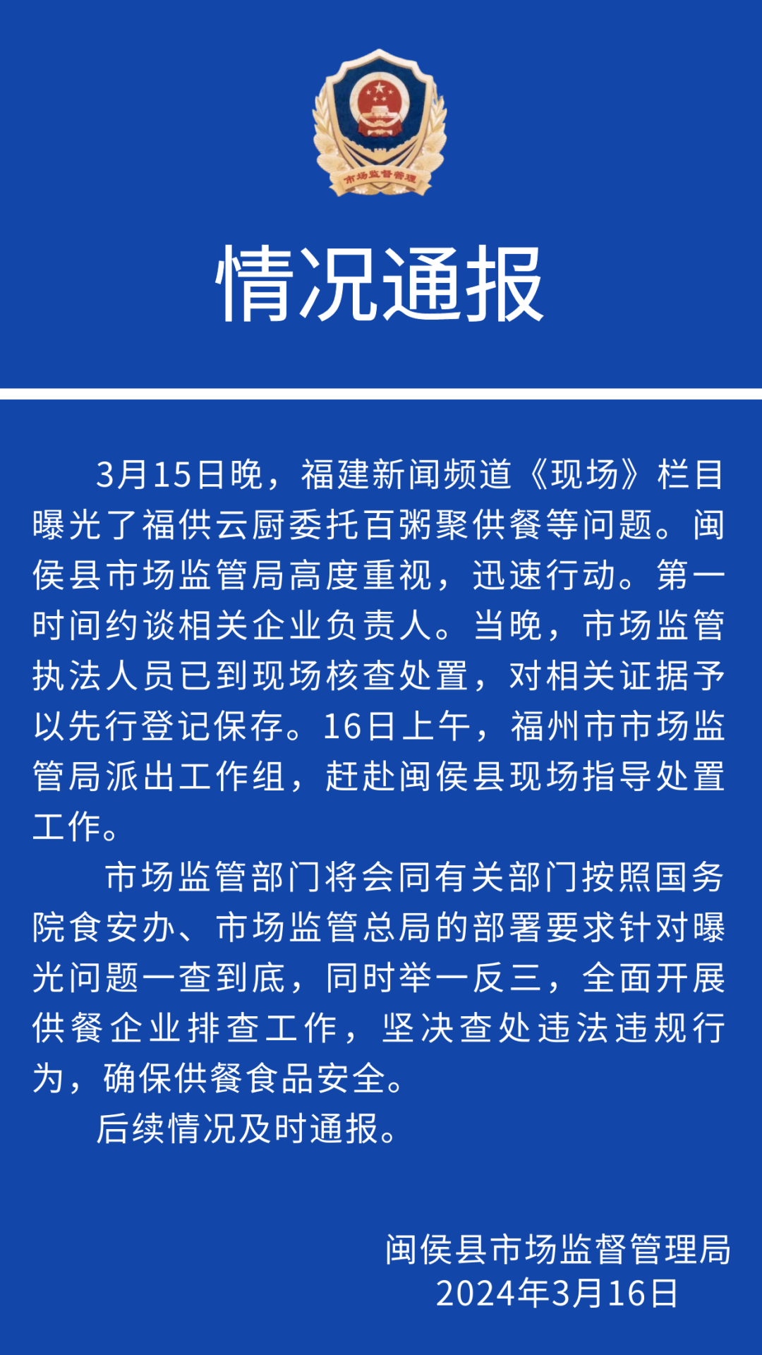 3月15日晚,福建新聞頻道《現場》欄目曝光了福供雲廚委託百粥聚供餐等問題,引發社會關注。3月16日下午,福州市閩侯縣市場監督管理局在其公眾號回應稱:執法人員已到現場核查處置,對相關證據予以先行登記保存,並表示對針對曝光問題一查到底。