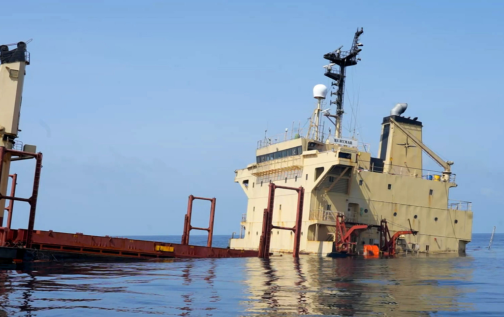 3月3日,被也門胡塞武裝襲擊後,英國註冊的貨船“Rubymar”在紅海沉沒 圖片來源:視覺中國