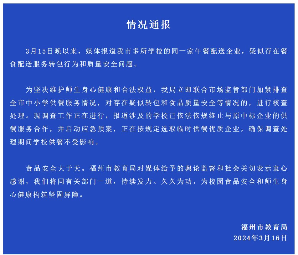 3月15日晚,福建新聞頻道《現場》欄目曝光福州市多箇中小學學生餐被轉包,引發社會關注。繼3月16日福州市閩侯縣市監局回應後,福州市教育局16日也在其公眾號“福州教育”發佈情況通報: