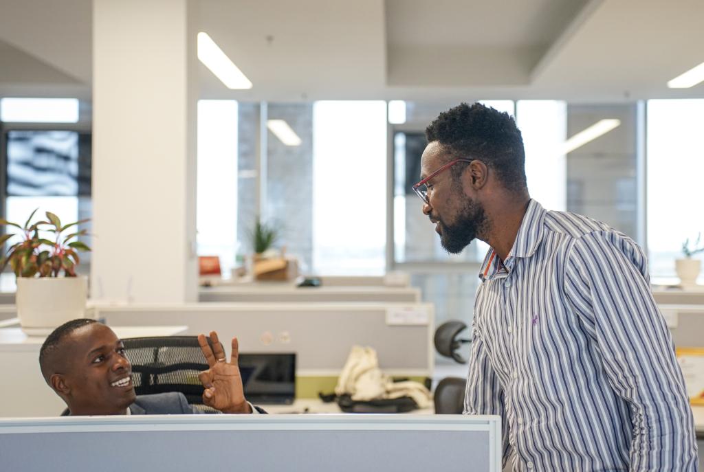 在安哥拉首都羅安達華為安哥拉科技園區,路易斯·埃裏瓦爾多(右)和同事交談。