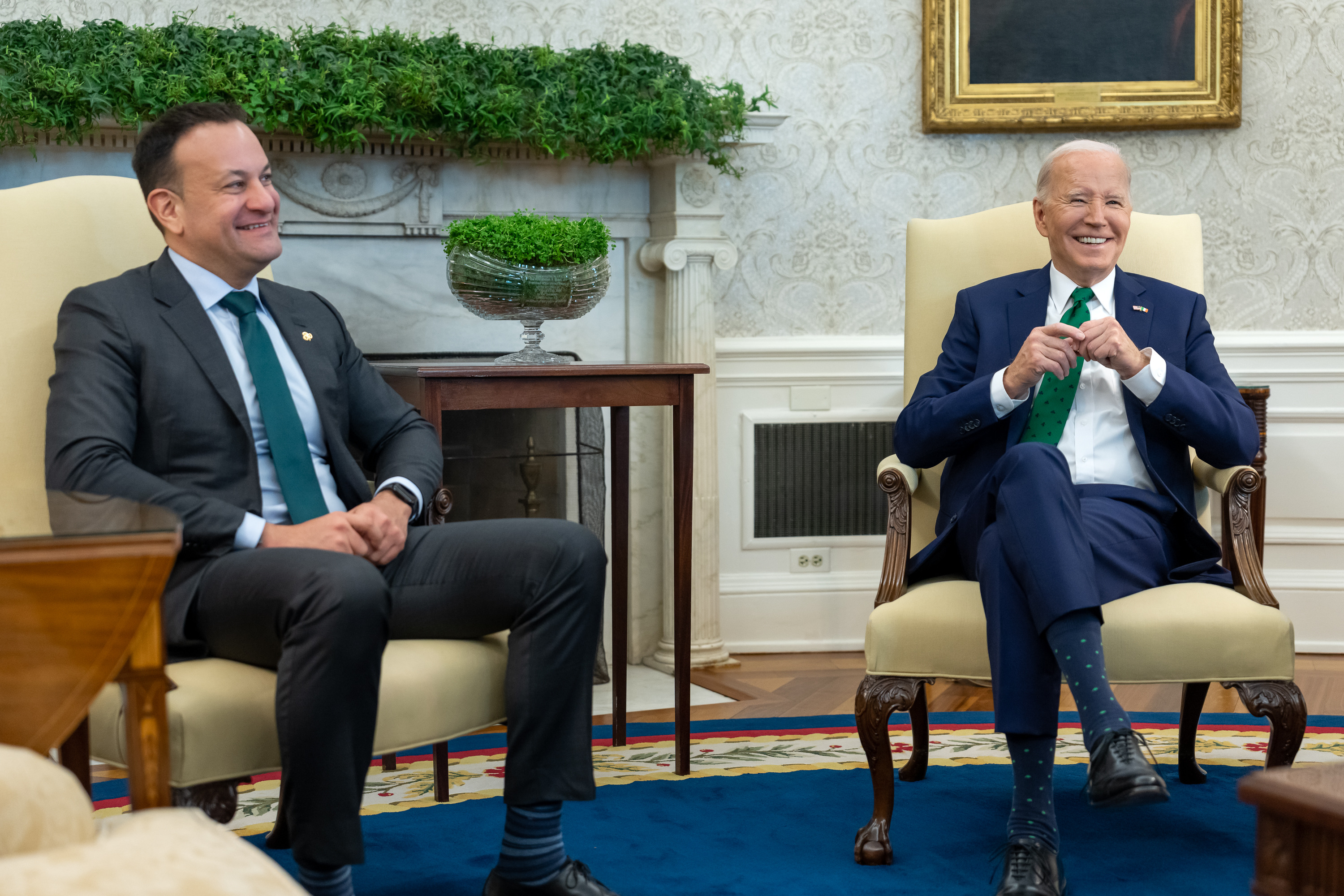 3月15日,拜登在白宮會見來訪的愛爾蘭總理瓦拉德卡。圖自拜登社交媒體賬號