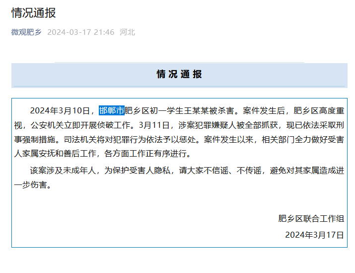 邯鄲肥鄉通報初中生被同學殺害:嫌疑人被全部抓獲,將依法懲處
