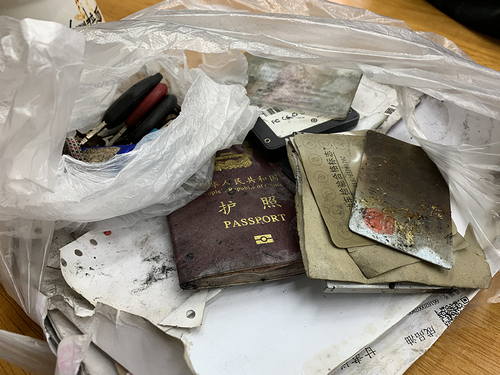 3月14日19點左右,澎湃新聞記者在一家麪館見到張磊。他手提的透明塑料袋裏裝了燒焦的身份證、護照、機動車駕駛證、一股糊味的發票、車鑰匙和硬盤。他説,上午通過保險公司找到了爆炸受損車輛的位置。由於車鑰匙也在車內,他使蠻力拽開車門。停車場裏,停了二三十輛受損的車。