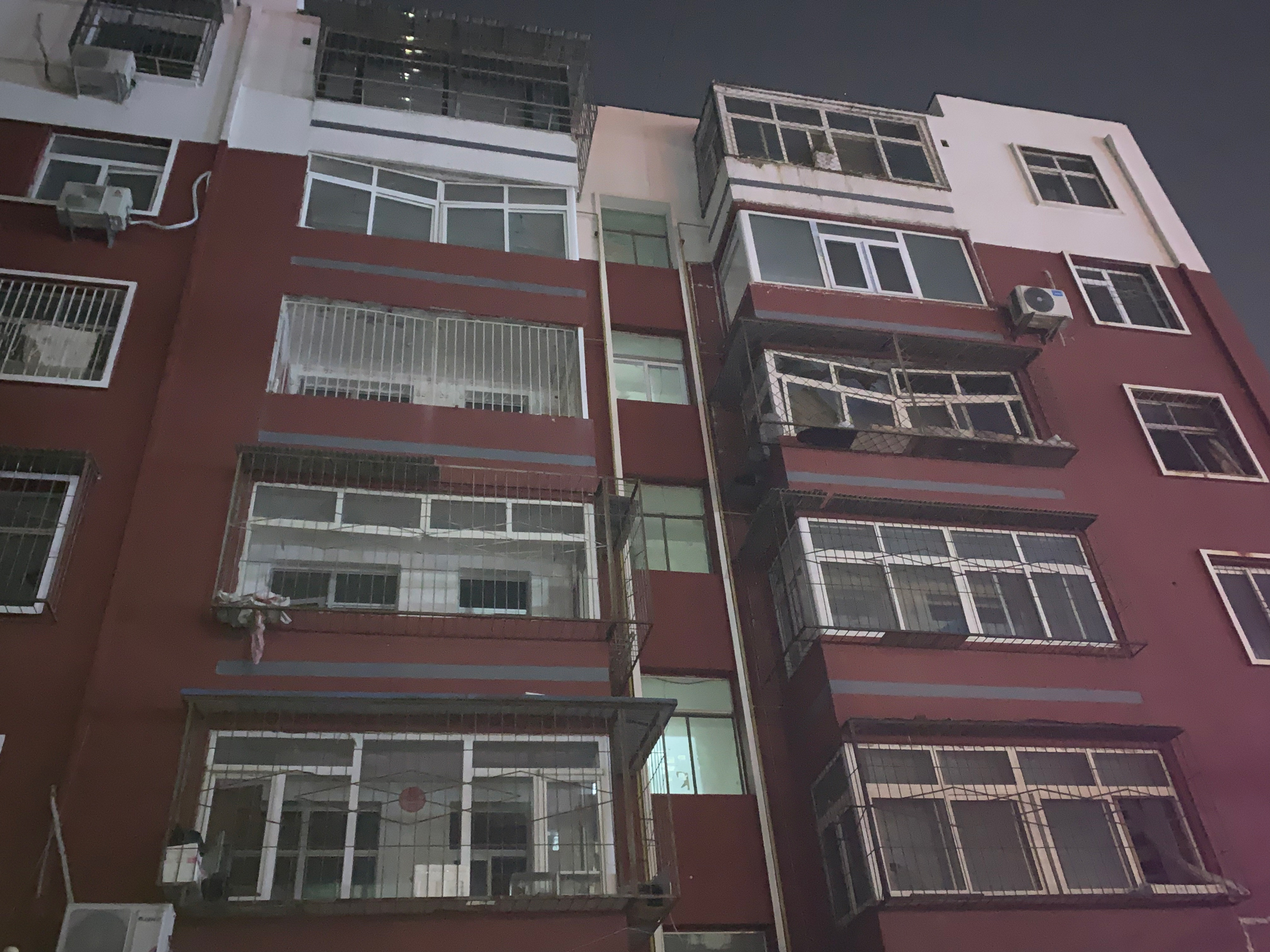 3月15日晚,小張各莊居民小區東區1號樓有的人家玻璃脱落,有的人家窗框向內凹陷