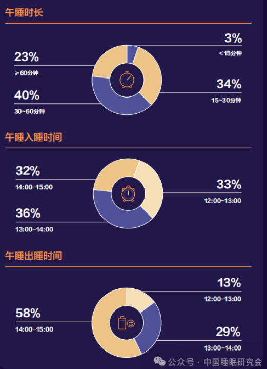 居民午睡時間普遍偏長,23%的人午睡時長超過一小時,半數以上人羣在14:00後才午覺醒來。白天睡太久會使夜間睡眠質量降低。