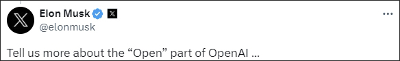 17日,馬斯克還在社交平台上發文對OpenAI進行了嘲諷:“告訴我們更多關於OpenAI開放部分的信息。”