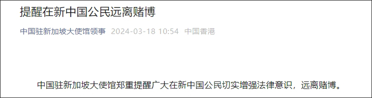 據微信公眾號“中國駐新加坡大使館領事”3月18日消息,中國駐新加坡大使館鄭重提醒廣大在新中國公民切實增強法律意識,遠離賭博。