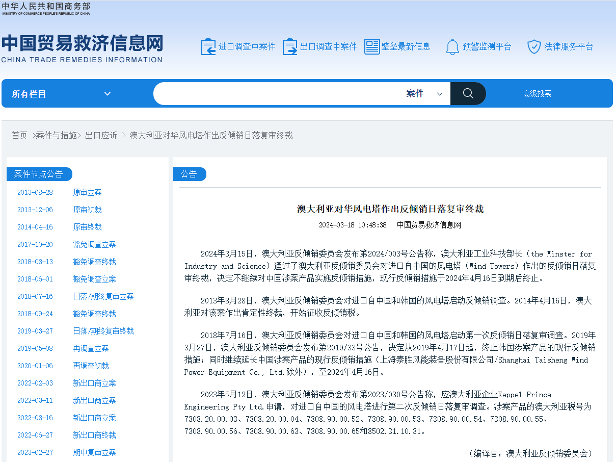 中國貿易救濟信息網消息,2024年3月15日,澳大利亞反傾銷委員會發布第2024/003號公告稱,澳大利亞工業科技部長(the Minster for Industry and Science)通過了澳大利亞反傾銷委員會對進口自中國的風電塔(Wind Towers)作出的反傾銷日落複審終裁,決定不繼續對中國涉案產品實施反傾銷措施,現行反傾銷措施於2024年4月16日到期後終止。