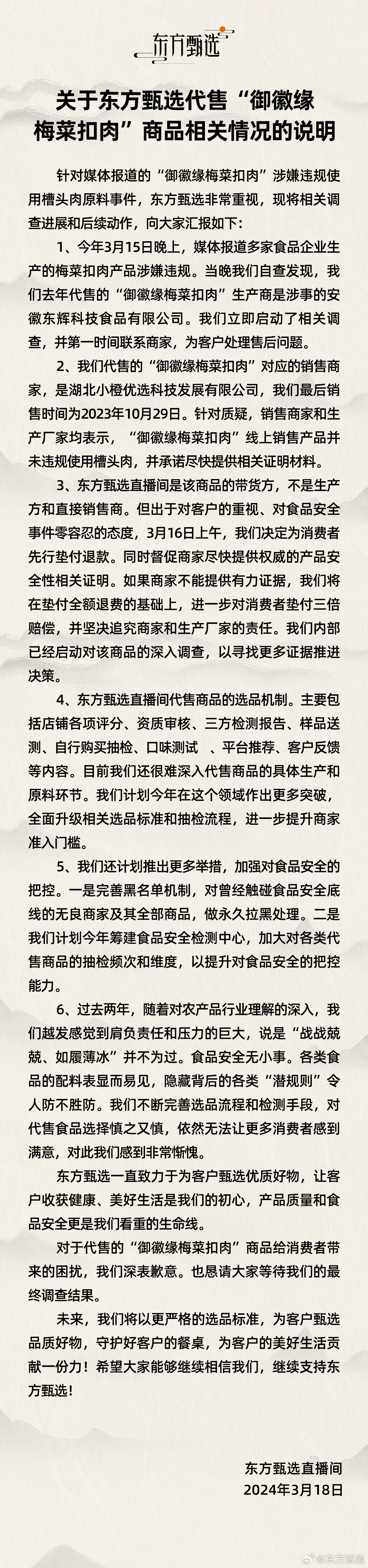 3月18日,@東方甄選發佈情況説明,稱“對於代售的‘御徽緣梅菜扣肉’商品給消費者帶來的困擾,我們深表歉意,向大家彙報相關調查進展和後續動作”: