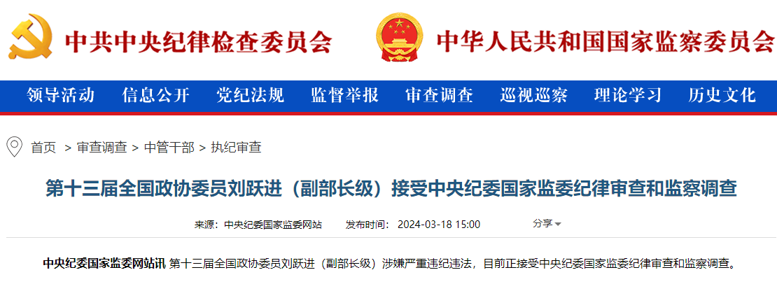 中央紀委國家監委網站消息,第十三屆全國政協委員劉躍進(副部長級)涉嫌嚴重違紀違法,目前正接受中央紀委國家監委紀律審查和監察調查。