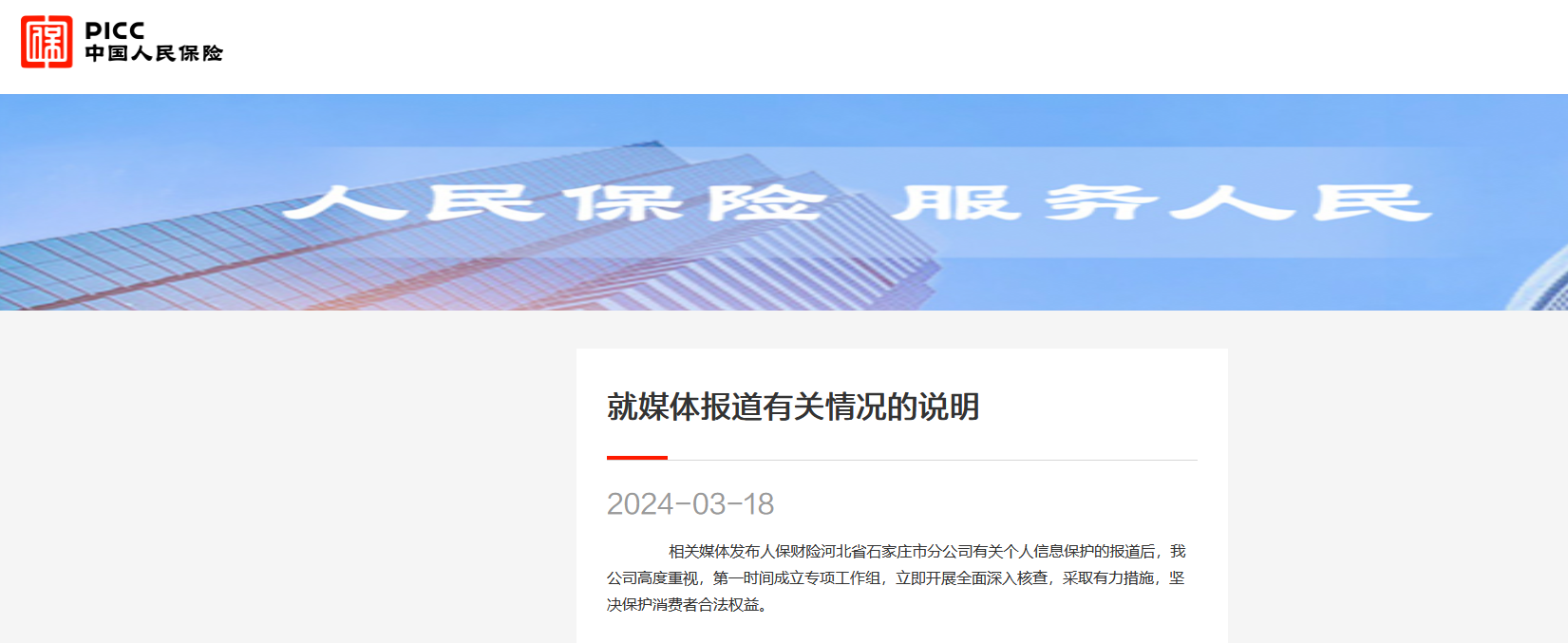 中國人民保險網站18日發佈情況説明稱:相關媒體發佈人保財險河北省石家莊市分公司有關個人信息保護的報道後,我公司高度重視,第一時間成立專項工作組,立即開展全面深入核查,採取有力措施,堅決保護消費者合法權益。