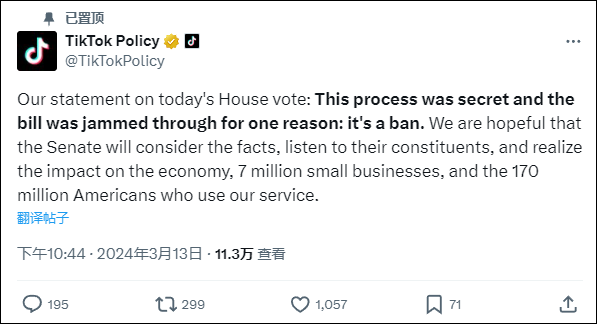 眾議院全體通過法案後,TikTok再次強調法案實質是禁令(圖截自:X)