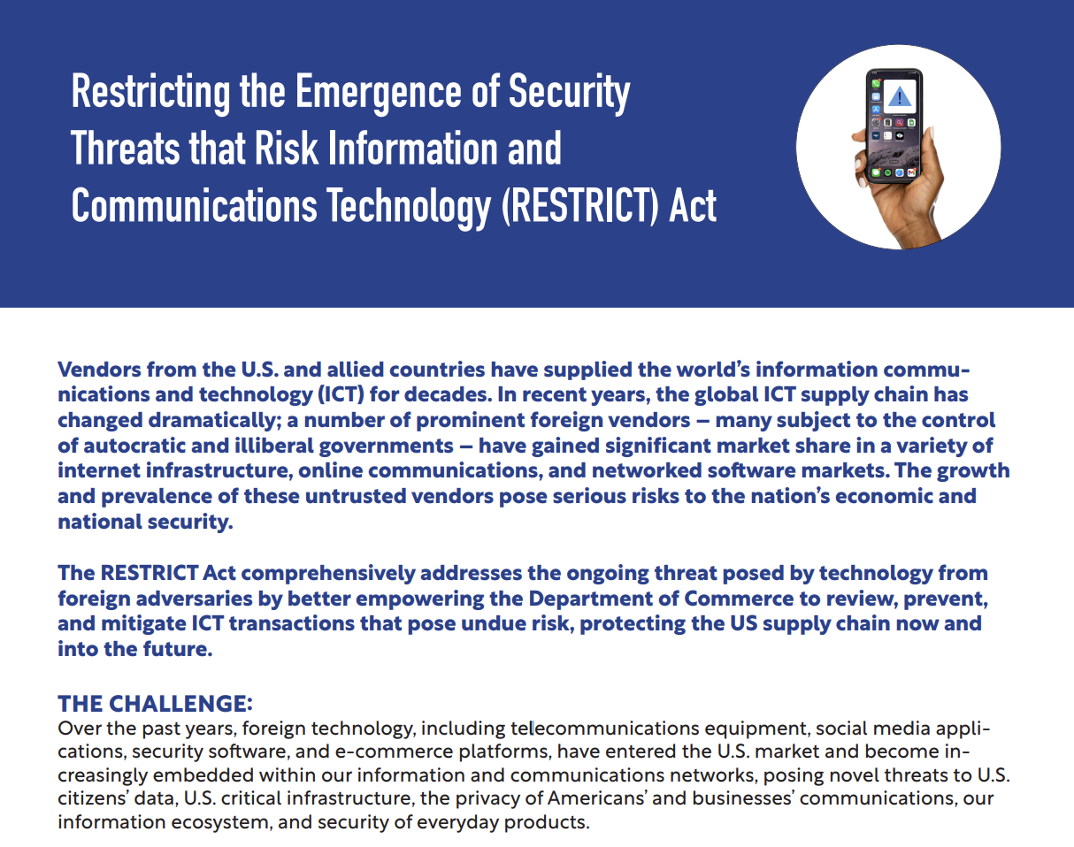 被視為關鍵人物的民主黨籍參議員馬克·華納與若干同僚提出的《限制危及資通訊技術安全威脅法案》(RESTRICT,Restricting the Emergence of Security Threats that Risk Information and Communications Technology),主張所有外國技術平台都要受到監管或排除,而不只是針對TikTok。將法案複雜化,可能意味着立法延宕。