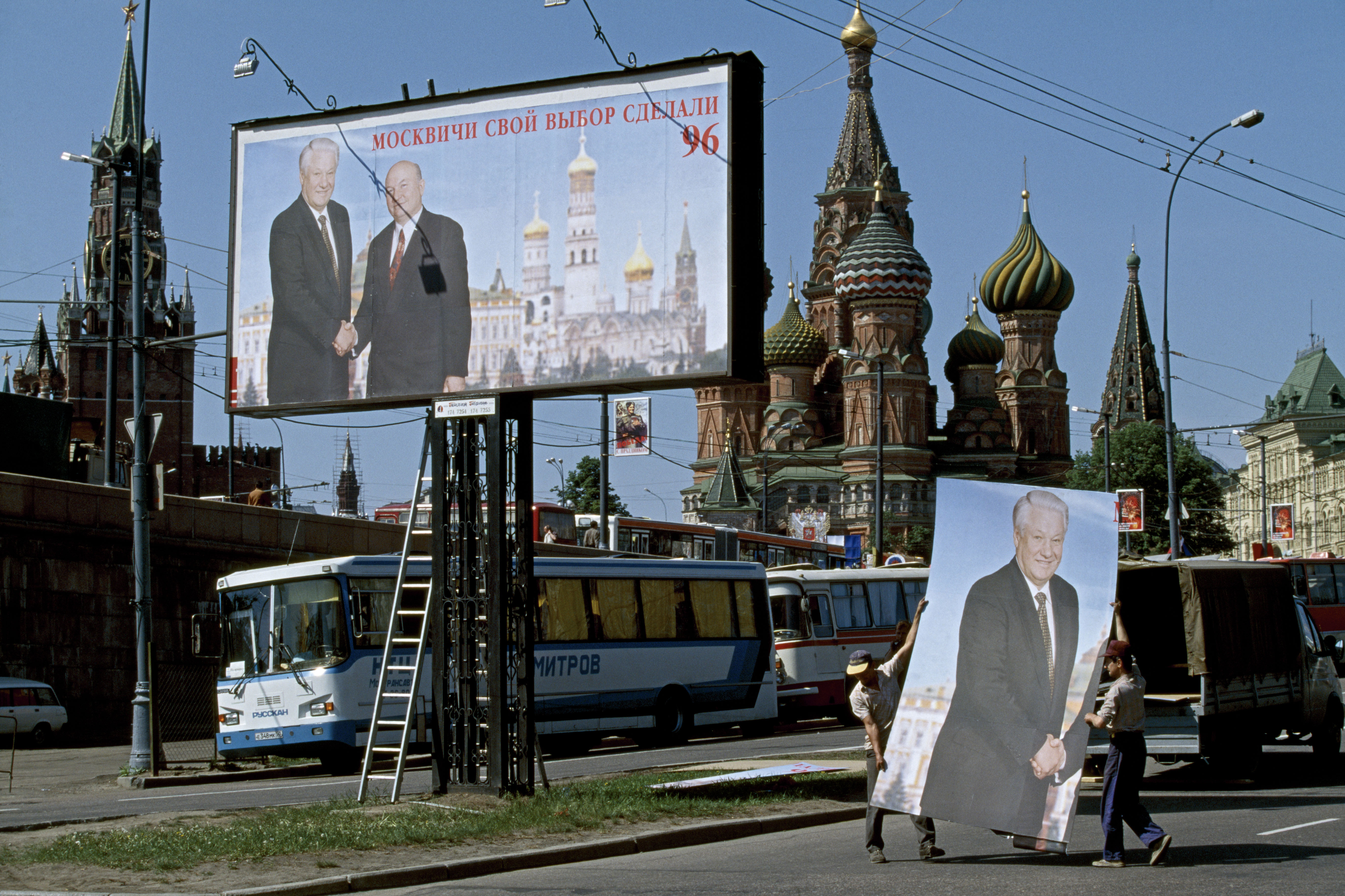 1996年,俄羅斯莫斯科,工人們在紅場旁懸掛葉利欽選舉宣傳海報(圖片來源:IC photo)
