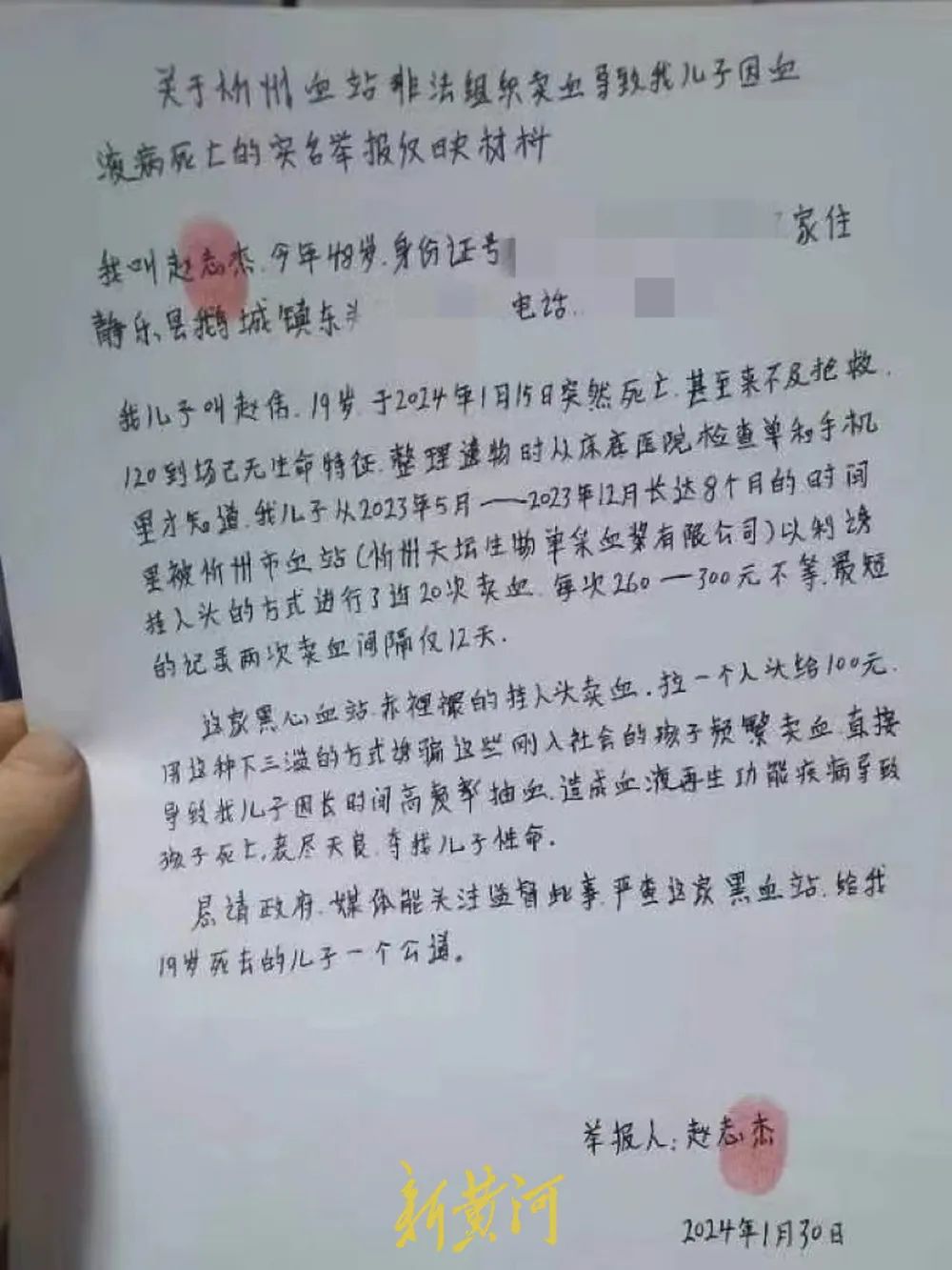 2024年1月15日,家住山西省忻州市靜樂縣的19歲少年趙偉在家中突然逝世。父親趙志傑在整理其遺物時發現,趙偉在逝世前八個月時間內疑似連續被抽採血漿多達16次,最短的“賣血”間隔天數為12天。遺物中還有一張趙偉在逝世十天前於當地醫院開具的檢查單,診斷顯示其重度貧血,疑出現造血功能障礙。