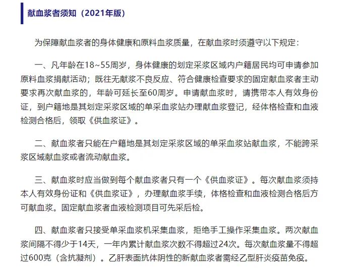 記者瞭解到,2021年9月2日,國家衞生健康委辦公廳發佈了《獻血漿者須知(2021年版)》。其中提到,獻血漿者只接受單採血漿機採集血漿,拒絕手工操作採集血漿。兩次獻血漿間隔不得少於14天,一年內累計獻血漿次數不得超過24次。每次獻血漿量不得超過600克(含抗凝劑)。此外,上述須知對獻血漿者體格檢查和血液檢測項目亦有明確要求。