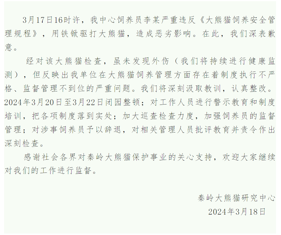 3月17日16時許,我中心飼養員李某嚴重違反《大熊貓飼養安全管理規程》,用鐵鍁驅打大熊貓,造成惡劣影響。在此,我們深表歉意。