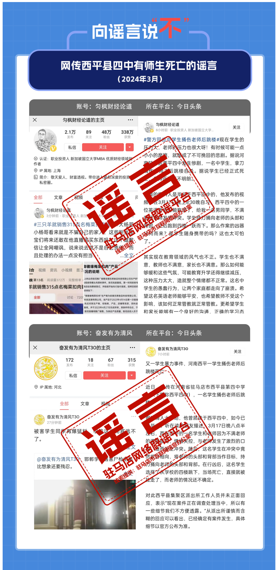 駐馬店市網信辦微信公眾號19日也發佈闢謠,表示網傳“西平縣四中有師生死亡”為謠言。