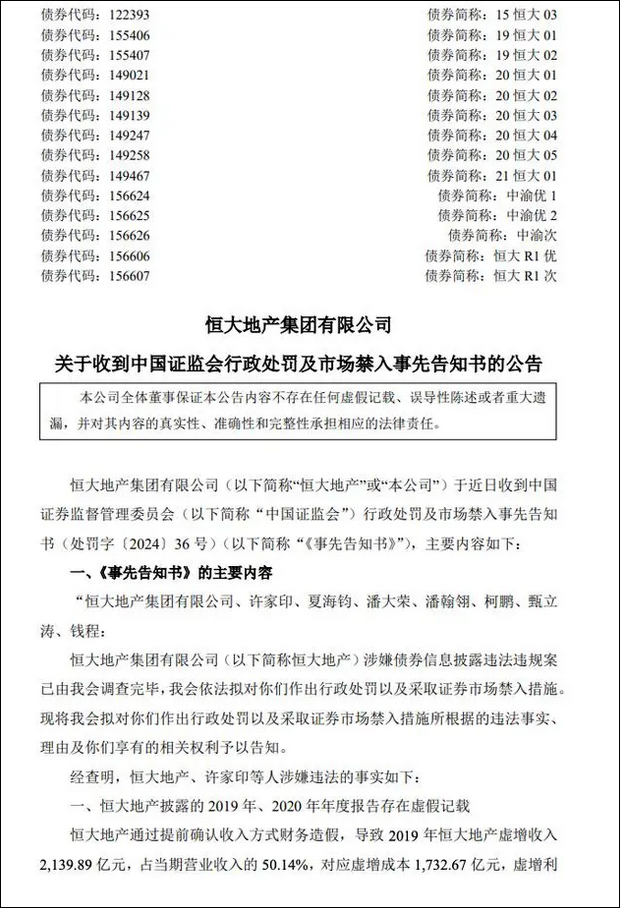 3月18日晚,恒大地產發佈《關於收到中國證監會行政處罰及市場禁入事先告知書的公告》,主要內容涉及恒大地產年度報告涉及虛假記載、恒大地產債券涉嫌欺詐發行及恒大地產未按規定及時披露相關信息等,以及對上述違法行為所作出的處罰規定。