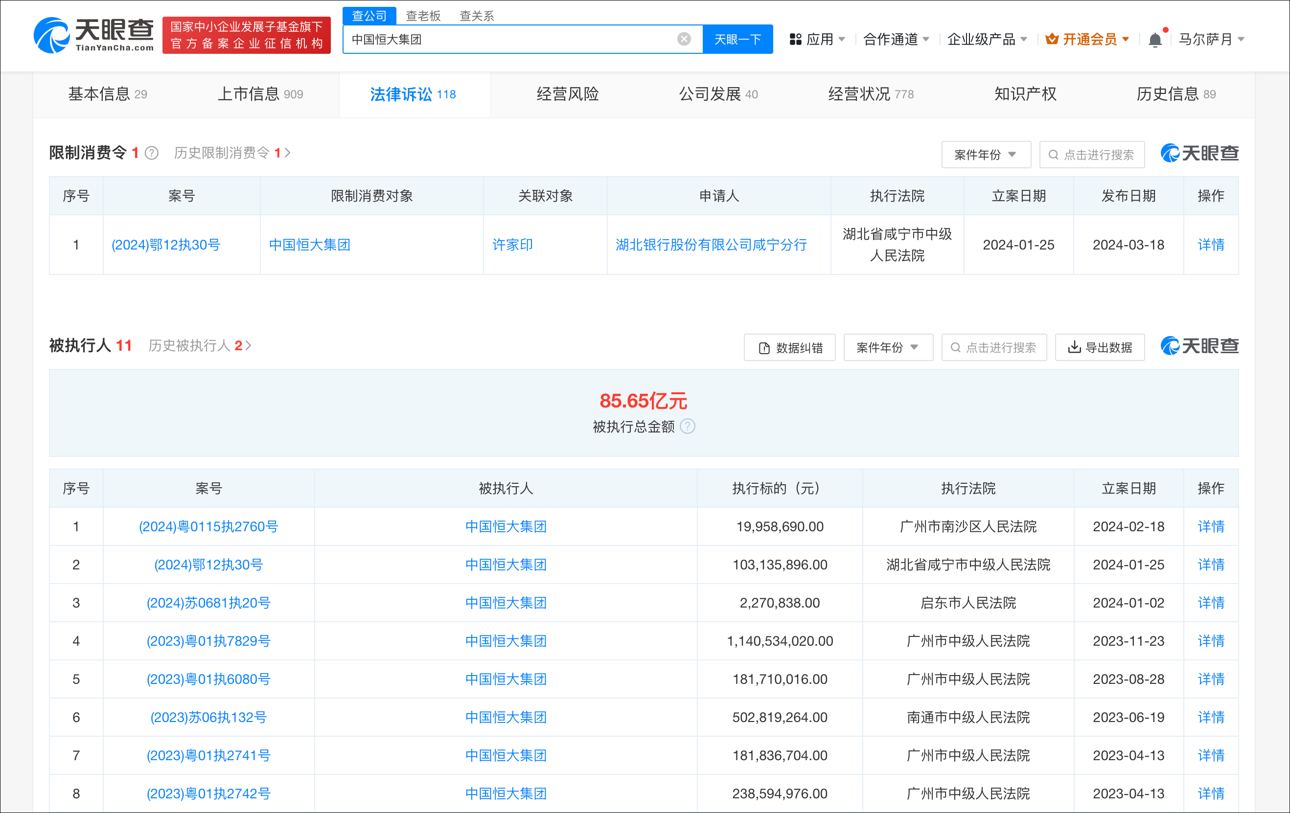 天眼風險信息顯示,中國恒大目前存在11條被執行人信息,被執行總金額超85億元。此外,恒大地產集團有限公司存在數百條被執行人信息,被執行總金額達數百億,恒大集團有限公司也存在上百條被執行人信息,被執行總金額超百億。