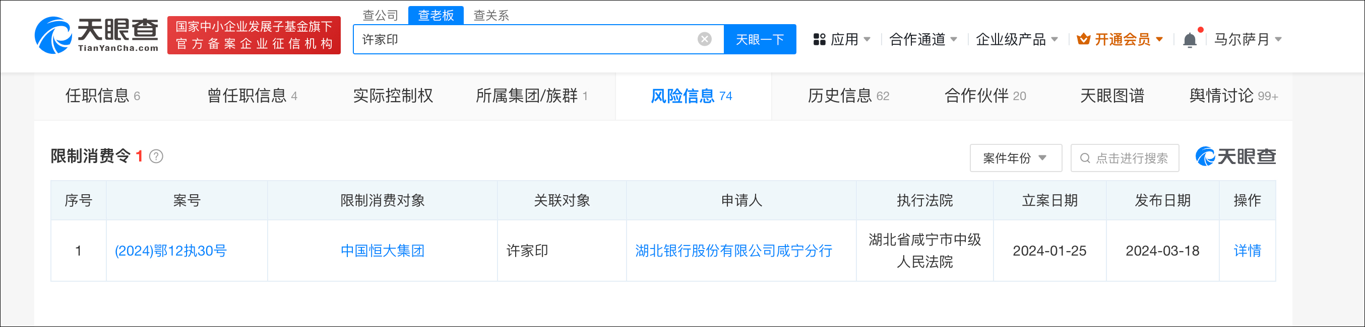 天眼查App顯示,3月18日,因未按執行通知書指定的期間履行生效法律文書確定的給付義務,許家印及中國恒大新增一則限制消費令,涉及借款合同糾紛案件,申請人為湖北銀行股份有限公司咸寧分行。