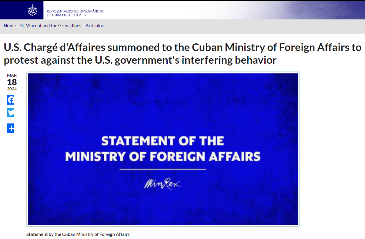 古巴召見美臨時代辦:停止煽動街頭騷亂,美方應對古巴經濟困境負責