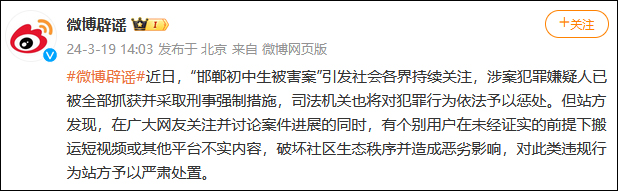 據@微博闢謠 3月19日消息,近日,“邯鄲初中生被害案”引發社會各界持續關注,涉案犯罪嫌疑人已被全部抓獲並採取刑事強制措施,司法機關也將對犯罪行為依法予以懲處。但站方發現,在廣大網友關注並討論案件進展的同時,有個別用户在未經證實的前提下搬運短視頻或其他平台不實內容,破壞社區生態秩序並造成惡劣影響,對此類違規行為站方予以嚴肅處置。