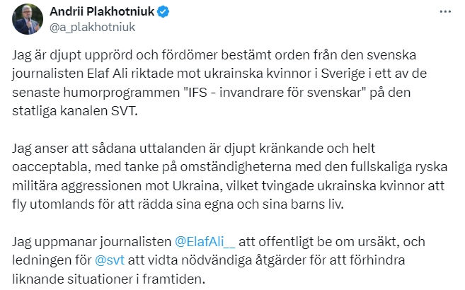 烏克蘭駐瑞典大使安德烈·普拉霍特紐克(Andrii Plakhotniuk)認為阿里的發言是在“嘲笑在瑞典的烏克蘭婦女”。上週五,他在個人社交媒體X賬號上怒斥阿里的言論“令人深惡痛絕,完全不可接受”,要求阿里公開道歉,並敦促SVT採取必要措施以防止類似情況再發生。
