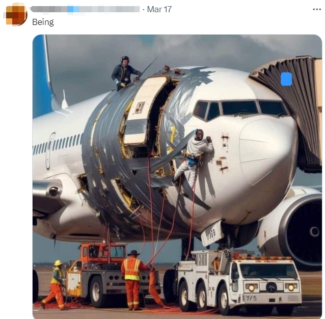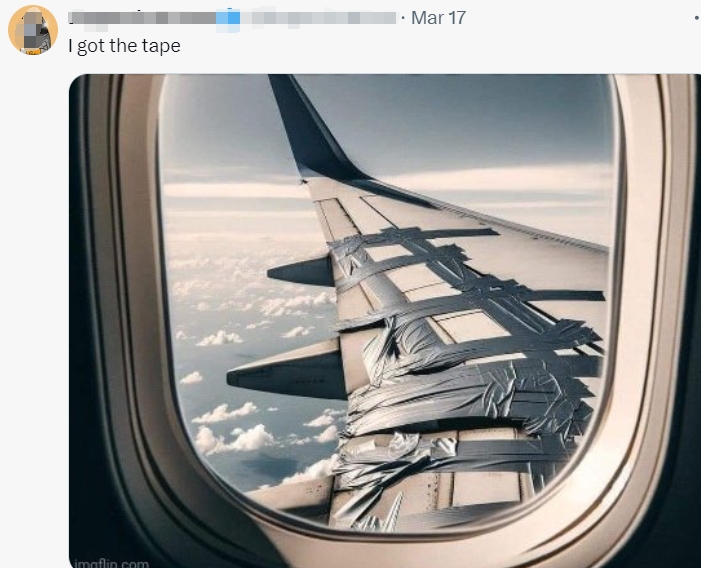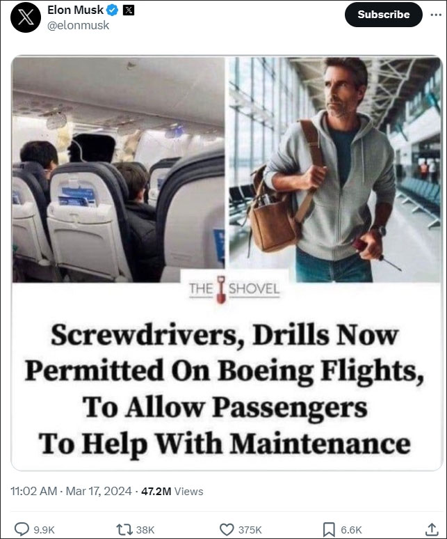 這位億萬富翁轉發的圖片顯示,製圖者是澳大利亞諷刺網站鏟子新聞“The Shovel”,圖中包含一張今年1月5日阿拉斯加航空公司波音737 Max 9型客機應急艙門掉落的圖片,並配了一張乘客手持螺絲刀候機的圖片。