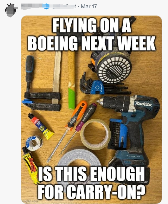 據“今日俄羅斯”3月18日報道,馬斯克17日在X平台轉了張梗圖,圖中配文是“螺絲刀和鑽機現在被允許帶上波音飛機航班了,以便乘客協助維修”。