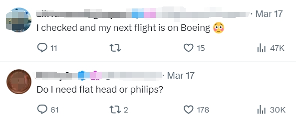 “今天看樂子,明天照鏡子。”在馬斯克的評論區,有網友的笑聲戛然而止,因為發現自己將要乘坐的機型就是波音。還有人“一本正經”地提問:“我應該帶平頭還是十字螺絲刀?”
