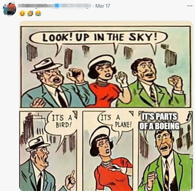 “看!天上是什麼?”“是隻鳥!”“是架飛機!”“是波音的零部件!”