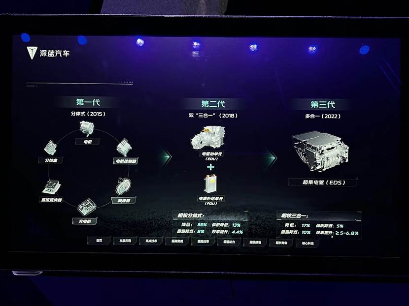 在保持永遠電車駕駛體驗的“爽”感上,深藍原力超集電驅2.0同樣發揮着重要的作用,在高集成方面,相較於1.0產品,2.0產品的電驅重量下降17%,電驅體積下降10%,並融入了電控分級模塊化集成、內置式冷卻水道/油道集成、一體化懸置集成、三段式三軸承集成等技術。