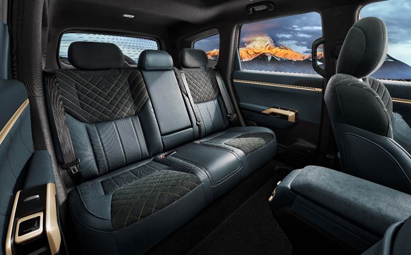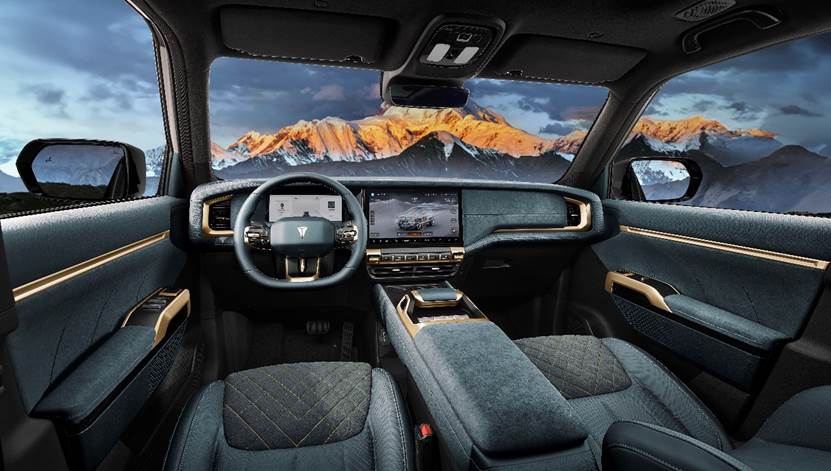前方擋風玻璃傾斜角度39度,可視角度23度,塑造出了座艙內更寬闊的視野;前後排鏤空上車拉手,則凸顯出車輛的十足力量感;內嵌式的屏幕設計,擁有13.6英寸的超大屏幕尺寸,下方還集成了大量多功能物理按鍵,令車輛在越野環境下做到操作的便捷性與科技實用性相結合。