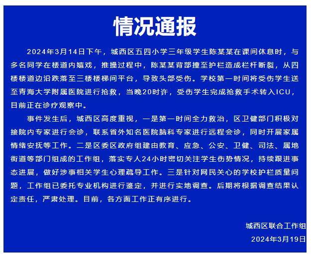 2024年3月14日下午,城西區五四小學三年級學生陳某某在課間休息時,與多名同學在樓道內嬉戲,推搡過程中,陳某某背部撞至護欄造成欄杆斷裂,從四樓樓道邊沿跌落至三樓樓梯間平台,導致頭部受傷。學校第一時間將受傷學生送至青海大學附屬醫院進行搶救,當晚20時許,受傷學生完成搶救手術轉入ICU,目前正在診療觀察中。