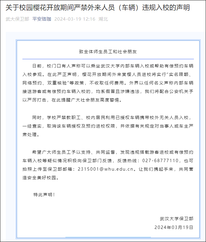 武漢大學保衞部微信公眾號“平安珞珈”3月19日發佈《關於校園櫻花開放期間嚴禁外來人員(車輛)違規入校的聲明》。