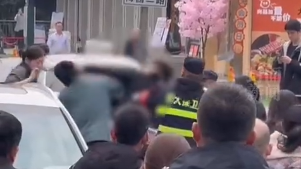 視頻中一輛白色轎車停在道路中央,對向車道不少電動車正在行駛,交通顯得異常擁堵。一名身穿綠色衣服的男子與另一名黑色衣服男子發生衝突,旁邊身着武大保衞制服的工作人員試圖將兩人分開。
