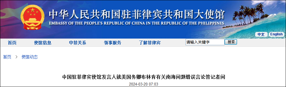 據中國駐菲律賓大使館網站3月20日消息,中國駐菲律賓使館發言人就美國務卿布林肯有關南海問題錯誤言論答記者問。