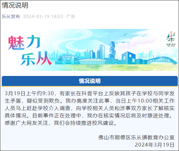 廣東佛山市順德區樂從鎮宣傳文體旅遊辦公室微信公眾號“樂從發佈”3月19日發佈情況説明稱,當天上午約9:30,有家長在抖音平台上反映其孩子在學校與同學發生矛盾,疑似受到欺負。該辦高度關注此事,當天上午10:00相關工作人員馬上趕赴學校介入調查,向學校相關人員和涉事雙方家長了解核實具體情況。